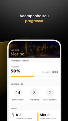 Acompanhe de perto seu progresso e evolução corporal. Anote suas cargas, faça comentários e deixe tudo registrado. Assim, você consegue atualizar melhor os seus treinos na hora certa, entender seu progresso e chega mais rápido nos seus resultados. E ainda dá para se manter motivado com gráficos e estatísticas que mostram a sua progressão. Incrível, né?