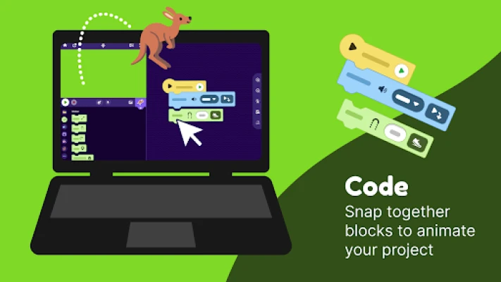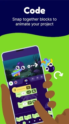 With OctoStudio, you can create animations and games on your mobile phone or tablet – anytime anywhere. Take photos and record sounds, bring them to life with coding blocks, and send your projects to friends and family.